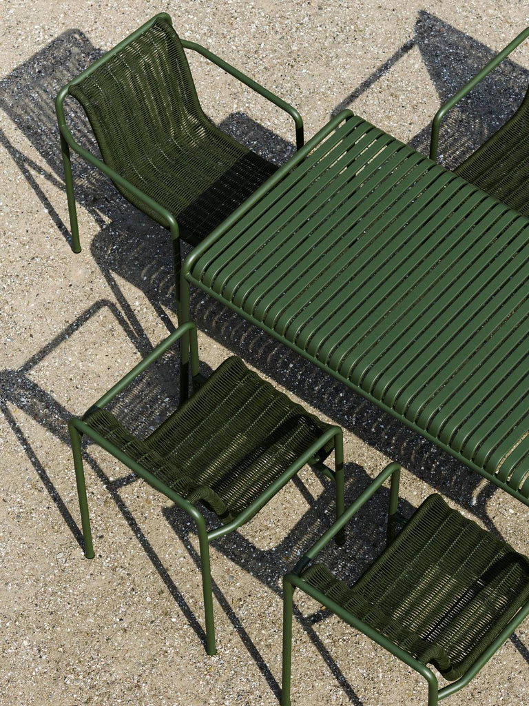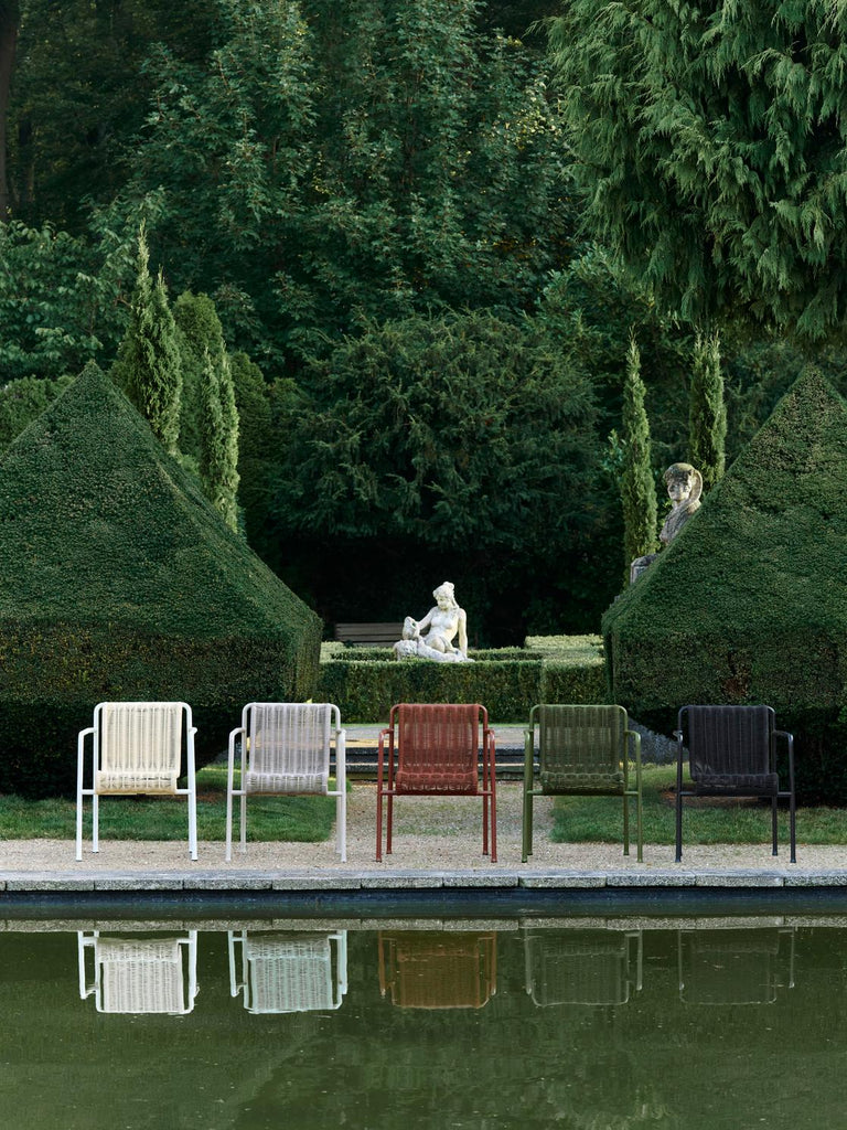 United by its common principle of symmetrical geometry, the Palissade collection of outdoor furniture is designed to integrate effortlessly into both natural and urban settings. The Palissade Cord Dining Armchair shares the same design language as the original collection, combining a softer expression with Palissade’s visual simplicity and core strength. Recycled polyester cord is handwoven onto the chair’s powder coated steel frame in a matching tonal colour, creating a comfortable and durable seat.