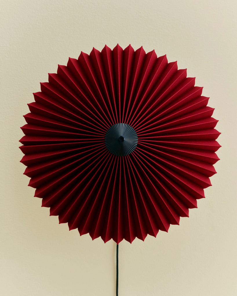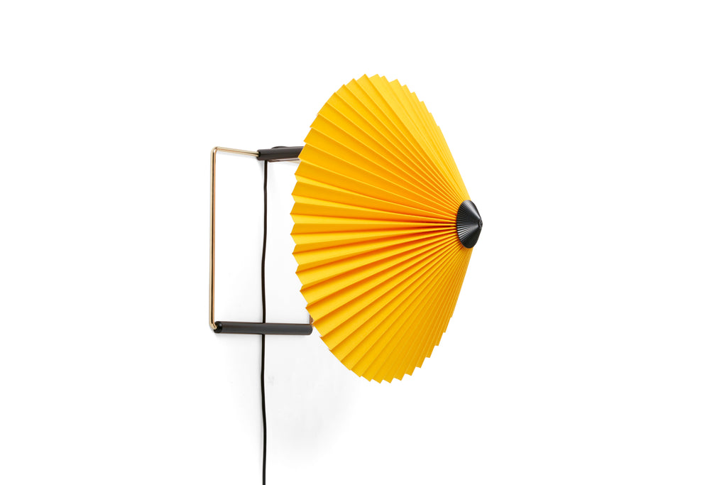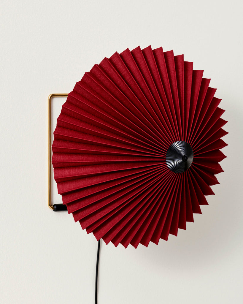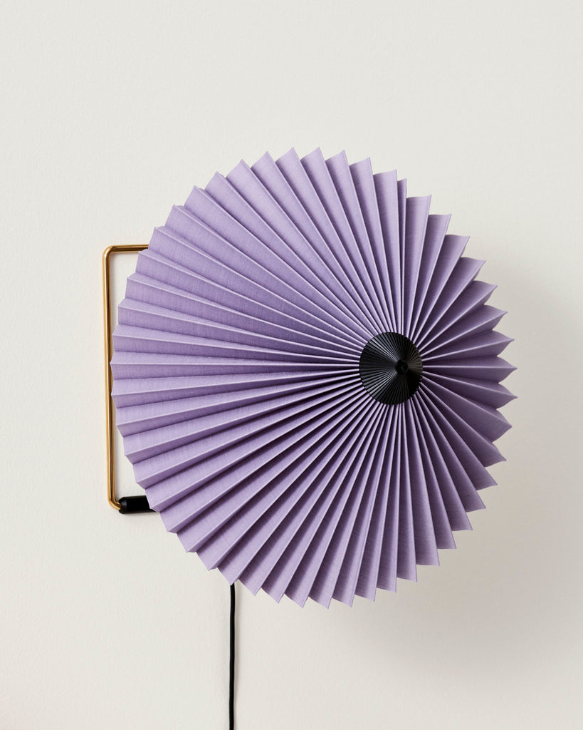 The Matin Wall Lamp offers a contemporary yet poetic design, with a construction that combines visual delicacy with physical robustness. The head of the lamp can be angled approximately 45 degrees both upwards and downwards to create an ambient uplight as well as directional downlight. The wall-mounted design consists of a steel wire bent frame finished in polished brass with matte black hardware and is paired with a pleated cotton shade in two sizes with a variety of vibrant colours. The light source is an integrated LED, offering a diffused light which is accompanied by a digital inline dimmer control to adjust the output of light if required.